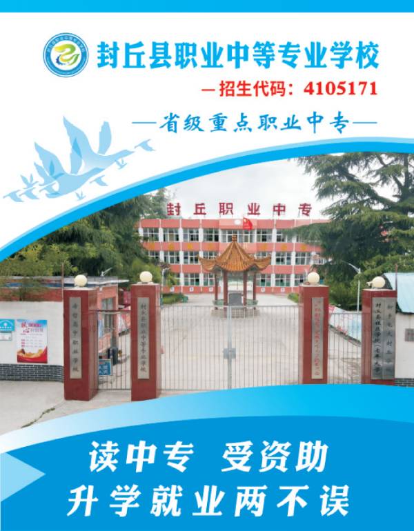 封丘县职业中等专业学校是一所集中等职业教育、实用技术培训与人才输出为一体的河南省重点中等职业学校,中等职业教育特色学校,中等职业教育特色专业项目建设学校。2022年4月被新乡市人社部门认定为封丘县唯一的一所职业技能等级鉴定中心。学校创建于1992年,占地35亩,建筑面积5516平方米,校园环境优雅、空气清新宜人、交通便利。学校现有教职工97人,高级教师23人、中级教师59人,现开设作物生产技术,计算机应用、运动训练、舞蹈表演等专业,学生实训条件充盈,设备先进,配有音乐室、微机室、仪器室、图书室、多媒体教室、舞蹈练功室等。教师教学态度严谨、教学成果突出,近几年来毕业生就业率98%,对口升学率达95%。学校以"明德致远、博爱笃行"为校训,营造健康向上、青春活泼的校园文化氛围。